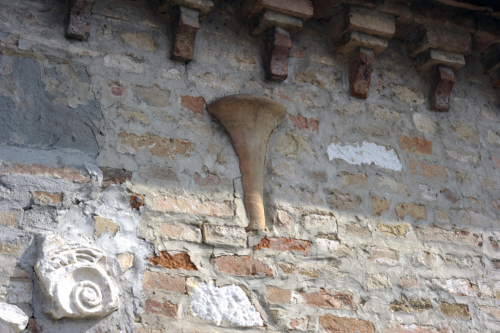 La forma del manufatto non rientra tra le tipologie note; potrebbe trattarsi di un sostegno da mensa e in questo caso è possibile che sia stato murato in posizione inversa; non si esclude nemmeno l'ipotesi che sia un elemento lavorato da Celso Costantini. La condizione frammentaria e la tipologia difficilmente riconoscibile non consentono di attribuire al pezzo una cronologia, nemmeno generica; la sua collocazione, inoltre, ha impedito di rilevarne la misure.
