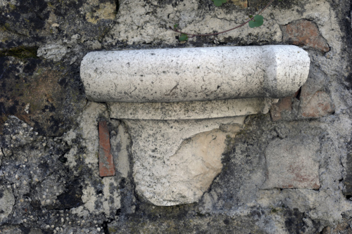 Colonnina o semicolonna con parte sommitale modanata, lavorata nello stesso blocco; sopra la colonnina, a fusto liscio e leggermente rastremato verso lalto, si distingue un collarino piatto e un toro liscio, il cui lato destro è a sua volta modanato a sezione ovale.
