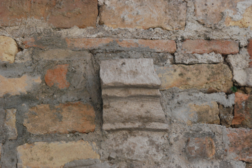 Frammento di cornice modanata scandita, a partire dall’alto, da un listello piatto, una gola diritta e un listello.