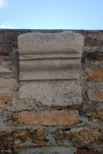 Pilastrino a sezione parallelepipeda, con cornice aggettante modanata, che si articola, a partire dallalto, in unalta fascia, un breve listello e una gola rovescia.