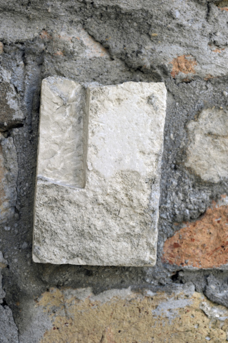 Frammento angolare di cornice, a listello piatto, con piano ribassato solo bozzato.