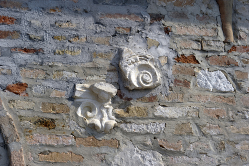 A sinistra, frammento di capitello corinzieggiante di lesena, di cui si conserva la parte centrale dellabaco, definita superiormente da un listello, e il fiore centrale, di cui è visibile parte del calice con uno stelo che si sviluppa a voluta; a destra, frammento di capitello ionico di lesena, di cui si conserva parte dellechino con tralcio vegetale a foglia acantiforme che si allunga nel canale della voluta ionica.
