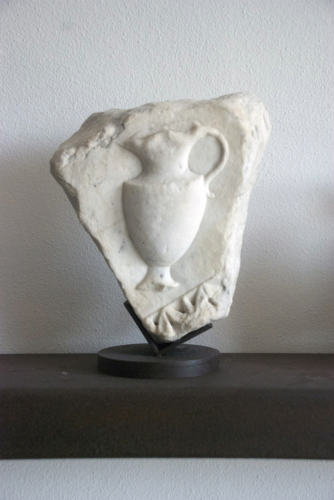 Elemento di coronamento a edicola, con brocca trilobata a rilievo pertinente a un coronamento a edicola probabilmente riferibile al timpano, modanato lungo il margine inferiore da un kymathion lesbio continuo e con una brocca trilobata su alto piede, con ansa, nello spazio del frontone.