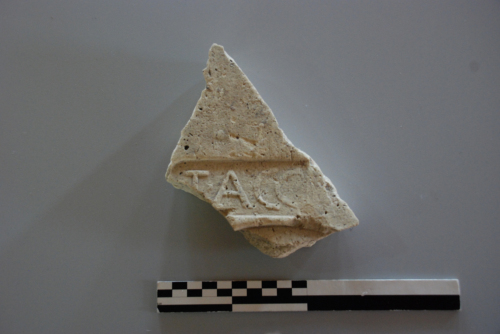 Tegola con bollo a lettere rilevate, all'interno di un cartiglio rettangolare. Si osserva un legamento tra le lettere LA e un segno di interpunzione circolare.