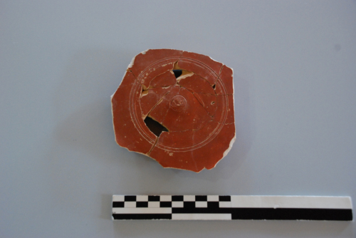 Fondo piatto con piede ad anello leggermente obliquo, con spessore irregolare; tre linee concentriche incise sul fondo incorniciano un bollo impresso all'interno di un cartiglio rettangolare, con lettere rilevate su due righe, separate da una palmetta orizzontale. Sulla prima riga le lettere AG, sulla seconda AT in nesso.