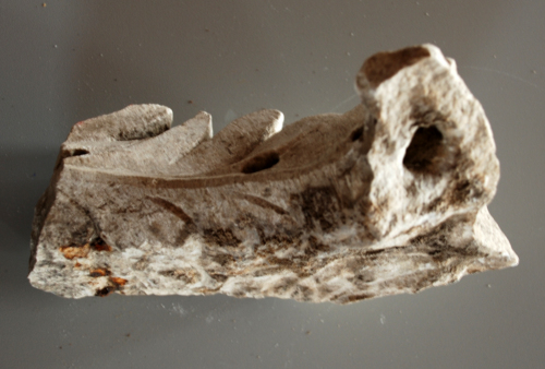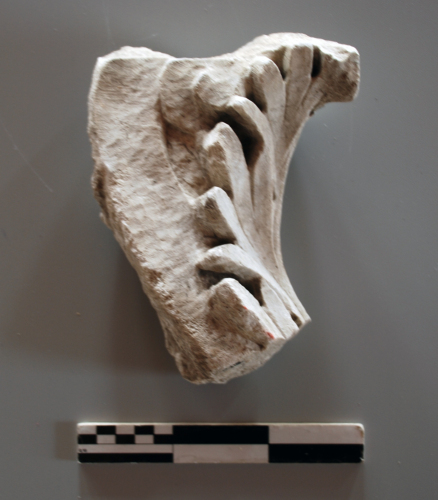 Foglia d'acanto frammentaria, pertinente probabilmente a un capitello di lesena. Levigata lungo il margine inferiore, sia sulla fronte, che sul retro. Tracce di una grappa in ferro nella parte inferiore.