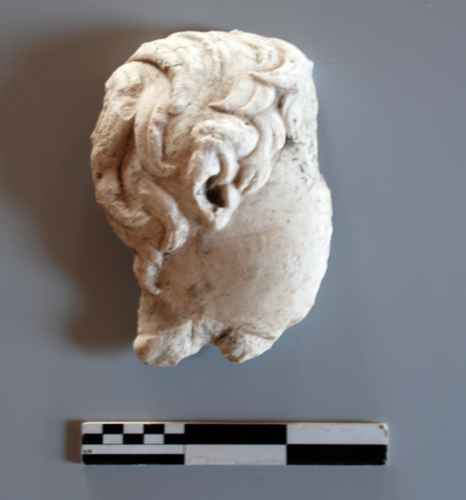 Lato destro della testa di una piccola statua, di cui rimane parte della guancia, dal morbido modellato, priva della linea ello zigomo, l'orecchio destro piccolo, incavato, delineato plasticamente, ma privo di troppi particolari, e la capigliatura fin quasi sulla sommità del capo. La massa dei capelli, più gonfi sulla tempia, con ciocche ondulate, ma prive di riccioli, scende dalla sommità verso l'orecchio e il collo. Il volume e l'articolazione sono resi da sapienti incisioni che staccano le ciocche dalla massa e le ripartiscono in due o tre lembi. Il volto era probabilmente leggermente inclinato verso destra, come sembra suggerire l'attacco del collo.