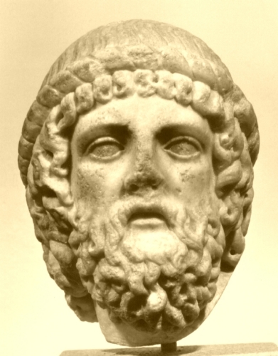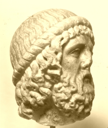Testina di vecchio, caratterizzata da una lunga capigliatura circoscritta da un grosso cercine, con ciuffi spessi e spioventi, con ciocche che partono dalla collottola e terminano sulla fronte a guisa di piccoli uncini, mentre ai lati del volto e sul collo scendono in forma serpentina. Il volto, con baffi spessi e spioventi, è incorniciato da una ricca e fluente barba a ciuffi ondulati che terminano con punte ricurve.