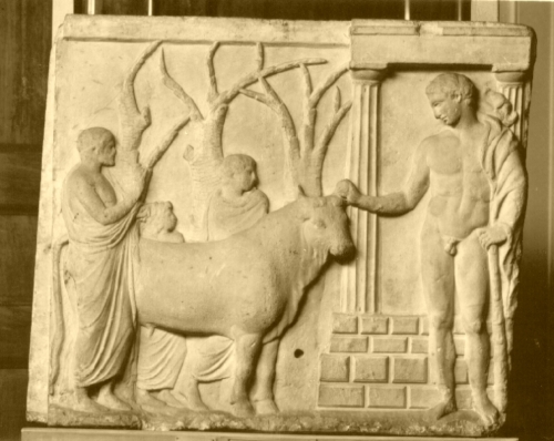 Rilievo votivo che raffigura lofferta di un toro a Herakles da parte di tre supplici. Il dio, con il corpo di prospetto e la testa di profilo rivolta verso sinistra, è raffigurato a destra del rilievo, davanti al tempio di cui è visibile il basamento, una colonna e parte del frontone; completamente nudo, a eccezione del mantello che gli avvolge il braccio sinistro disteso lungo il fianco, Herakles è in atto di posare la mano destra su un corno del toro in segno di benevolo accoglimento dell'offerta. A sinistra del rilievo, tre supplici, raffigurati di profilo e con proporzioni diverse, in cui si deve riconoscere un padre con i suoi due figli, offrono un toro al dio. Sullo sfondo, tre alberi evocano il bosco sacro.