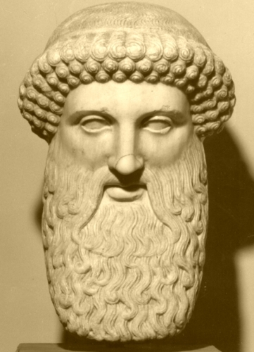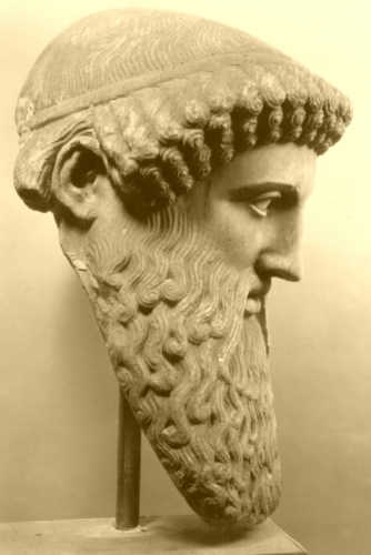 Testa di Hermes, con capigliatura a tre file sovrapposte di boccoli chioccioliformi che coronano il volto, caratterizzato dalle arcate sopracciliari delicatamente arcuate, dagli occhi aperti, dal labbro inferiore sporgente e carnoso e dalla lunga barba a ciocche serpentiformi, con le estremità delle punte leggermente ricurve. I baffi hanno propaggini ondulate.