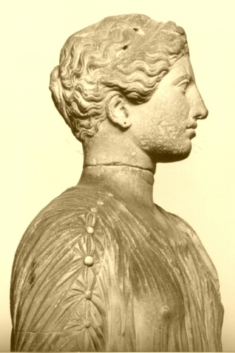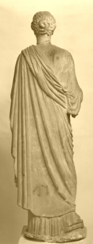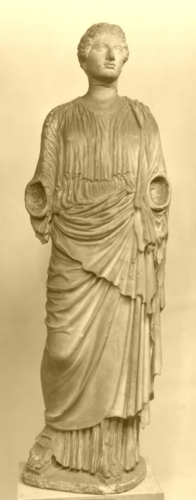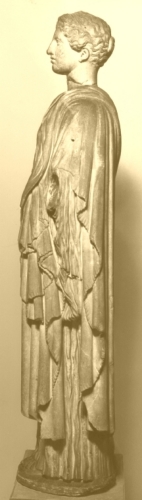 Figura vestita con peplo e mantello caratterizzati dalle fitte e mosse increspature del panneggio.