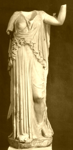 Figura stante con la gamba destra portante; veste peplo caratterizzato da fascio rigido di pieghe lunghe, dal lembo inferiore del kolpos e dell'apoptygma arricciato, e quello superiore trasparente.