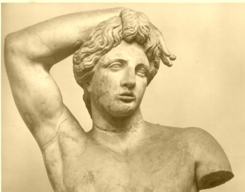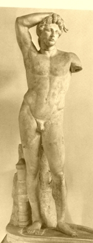 Figura maschile, stante, nuda, con la mano destra portata sulla testa; il volto è caratterizzato dagli occhi dall'espressione vagamente trasognata.