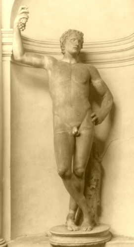 Figura maschile stante, con grappolo d'uva nella mano destra alzata.