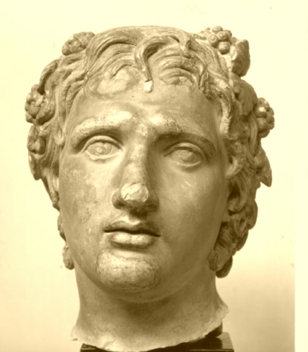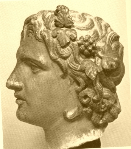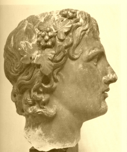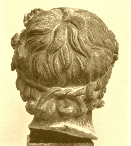 La testa è caratterizzata dai capelli spartiti sopra la fronte, con le ciocche serpentine e con l'estremità a uncino, e dalla corona d'edera e di corimbi.