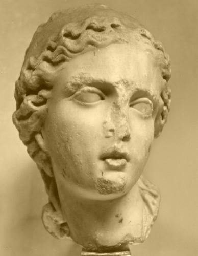 Testa, lievemente rivolta a destra, presenta una fronte alta, occhi asimmetrici e grandi, bocca piccola e socchiusa.