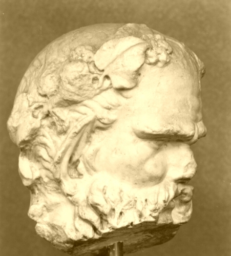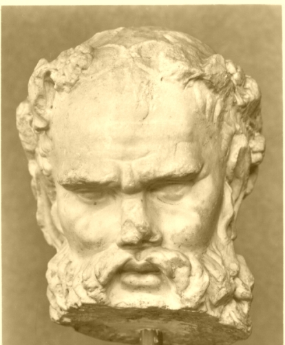 Testa maschile, coronata d'edera e di corimbi, presenta una capigliatura a ciocche brevi, una folta barba e baffi a tenaglia.