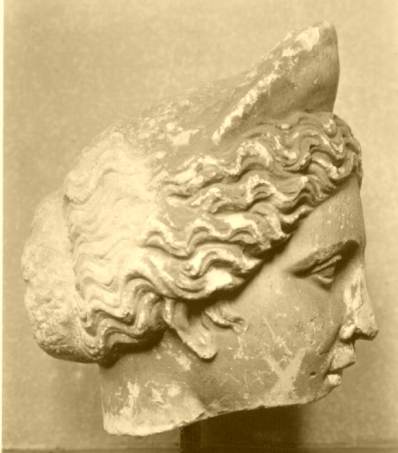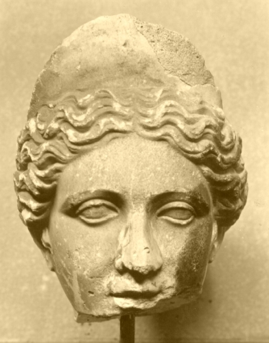 La testa, dall'ovale pieno e lievemente inclinato verso sinistra, ritrae una donna dalla fronte di forma triangolare pienamente investita dalla luce. Le arcate soppracigliari sono rese a spigolo vivo ed conferiscono severità e serietà al volto, ombreggiando i grandi occhi dalla forma a mandorla. Il naso, opera di restauro come pure le labbra socchiuse, è diritto e molto deteriorato.