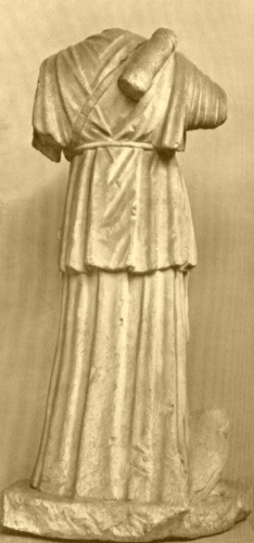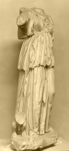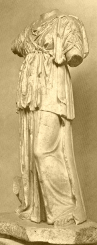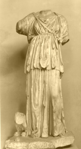 Figura stante, vestita di chitone ionico e di peplo dorico altocinto con ai piedi un animale.