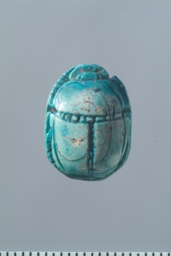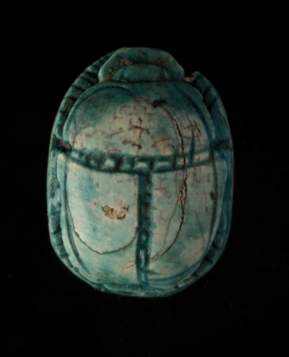 Scarabeo:sulla faccia superiore sono indicati in rilievo e incisione la testa, il protorace, le elitre e le zampe; sulla faccia inferiore piana sono incise quattro scimmie disposte simmetricamente ai lati di una palma che costituisce l'asse verticale della composizione; i rami seguono il margine curvo superiore ddell'oggetto.