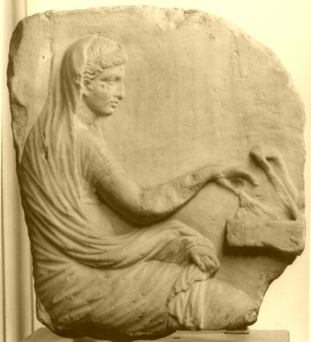 Una donna, dal capo velato, seduta verso destra, è in procinto di sollevare con un gesto delicato ed attento, un velo dal cofanetto che le offerto da una figura di fronte a lei. Essa lo sorregge con la mano sinistra, mentre con la destra sta per aprire il coperchio.