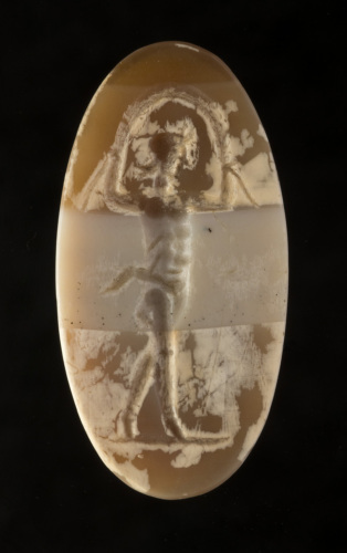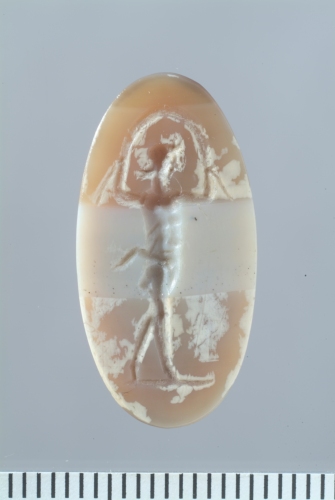 In un'agata zonata di forma ovale allungata è raffigurato un Satiro con il busto di tre-quarti, le gambe e la testa di profilo, in atto di incedere o di danzare verso des. in punta di piedi su una breve linea del suolo; con entrambe le braccia piegate ad angolo retto e sollevate tiene un nastro o un manto che si incurva ad arco sopra la testa. Il personaggio è caratterizzato da una coda equina (mancano tutti gli attributi caratteristici: grappolo d'uva, pedum, nebride). Da notare gli elementi globulari usati per indicare la muscolatura del busto.