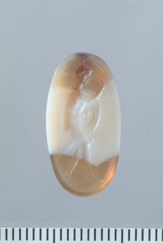 In un'agata zonata di forma ovale allungata è inciso un guerriero nudo con mantello allacciato attorno al collo, leggermente chiono in avanti, in atto di avanzare verso destra, con caratteristica andatura in punta di piedi; con la mano destra, rivolta verso il viso, compie un gesto particolare: indice e pollice sono sollevati e aperti, tutte le altre dita chiuse a pugno. Il guerriero nella mano sin.regge lo scudo e l'asta.In capo ha un elmo con ricco lophos. Il campo di incisione è racchiuso da un bordo zigrinato, su cui il personaggio posa i piedi (manca la linea del suolo).