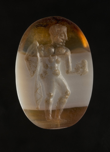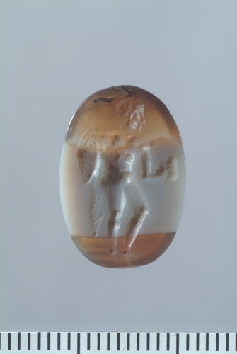 Su una pietra zonata di forma ovale è inciso un guerriero elmato, stante su breve linea del suolo, nudo, ma con il mantello avvolto sul braccio destro, con cui regge anche lo scudo; è raffigurato di profilo verso destra, con il busto di tre-quarti. Con il braccio sin. piegato regge una testa. La gamba destra portante è dritta, mentre la sinistra, in secondo piano è piegata. Da notare l'impiego di piccoli globuli per i particolari dell'immagine.