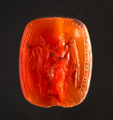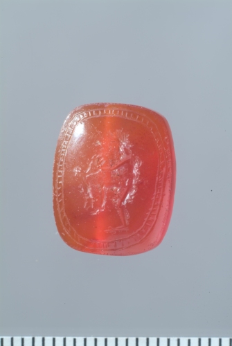 corniola rossa, convessa, forma rettangolare; incisa su due lati