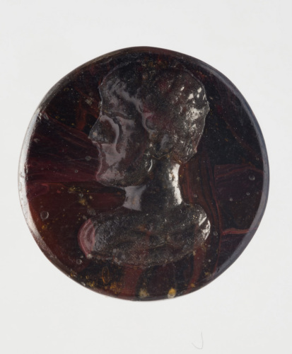 Busto maschile di profilo verso sinistra, con i capelli corti che lasciano scoperto l'orecchio resi a grosse masse plastiche. I tratti del volto risultano indistinti (si veda in particolare l'occhio e la bocca), ma si nota il naso imponente e il mento pronunciato. Alla base del collo è indicata la veste a grosse pieghe.