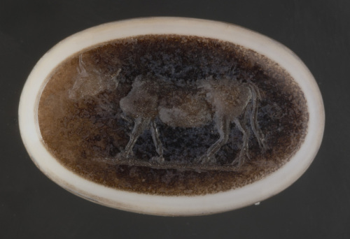 In un'agata zonata di forma ovale è inciso, con una disposizione in senso orizzontale, un bovide di profilo gradiente verso sin. su una lunga linea del suolo. La testa con le corna è lievemente sollevata verso l'alto. Rendimento dei particolari molto accurato. Da notare il taglio della gemma, parallelo rispetto agli strati cromatici della pietra.