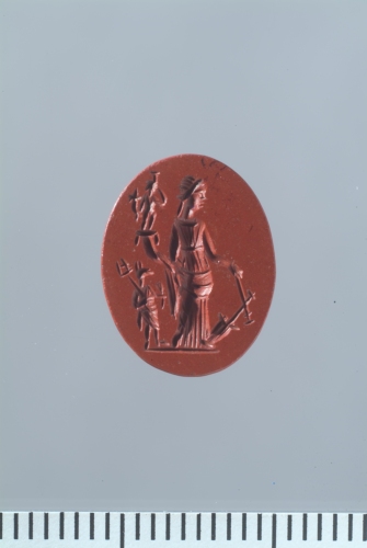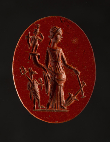 In un diaspro rosso di forma ovale è incisa Fortuna stante su linea del suolo, di prospetto,con testa di profilo verso des.; indossa un lungo chitone e un manto che serra la parte inferiore del corpo e ricade con un panneggio sotto il braccio des. Con la mano sin. rivolta verso il basso regge un timone ad ombrello, mentre col braccio des. sostiene la cornucopia (suoi abituali attributi). Dalla cornucopia fuoriesce la figura di un piccolo Arpocrate, nudo, stante, caratterizzato dal gesto tradizionale di portare il dito alla bocca; a sua volta il dio regge una cornucopia col braccio des. A sin. della dea, stante sulla linea del suolo, è raffigurato Anubi, con testa di cane (sciacallo) con caduceo a destra e piccolo ramo di palma stilizzato (?) a sinistra. Le figure delle due divinità egizie suggeriscono l'evidente sincretismo avvenuto tra Fortuna e Iside.