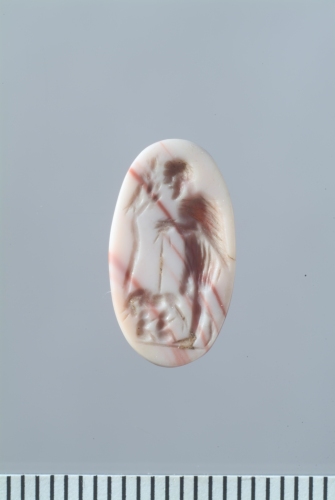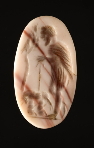 Su un'agata zonata di forma ovale allungata è raffigurato Faustolo con la lupa. Il pastore, barbato, stante sulla linea del suolo, di profilo verso sin., indossa una corta tunica e un mantello di pelle; con entrambe le mani si appoggia ad un bastone; la gamba destra, in secondo piano, è piegata e sfiora il suolo con la punta del piede. E' intento ad osservare la lupa retrospiciente che allatta i gemelli Romolo e Remo. Di fronte a Faustolo un albero (dovrebbe trattarsi di un fico) su cui è appollaiato il picchio.