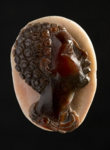 Nello strato marrone della pietra è raffigurato un busto, tagliato alla base del collo, di un giovane uomo moro imberbe, di profilo verso destra. La testa è leggermente levata verso l'alto. Il naso è piccolo, ben segnate le palpebre dell'occhio, le labbra sono carnose e sporgenti, il collo lungo e sottile. Caratteristica la raffigurazione dei capelli, a corti e piccoli ricci, a forma di chiocciola, che lasciano scoperto l'orecchio. Alla base del collo è raffigurata la veste, chiusa da una fibula rotonda.