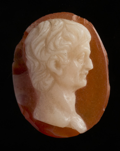 Sul fondo bruno del cammeo si staglia in bianco opaco una testa maschile di profilo verso destra, raffigurata fino alla base del collo. Il personaggio di età avanzata è caratterizzato dalla bocca piccola e dall'occhio dalla palpebra ben segnata; i capelli sono resi a lunghe ciocche ondulate,che lasciano l'orecchio destro scoperto.
