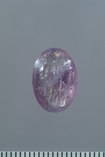 In un'ametista ovale è raffigurato Mercurio, nudo, stante di prospetto su breve linea del suolo, la gamba destra lievemente flessa, la testa di profilo verso destra. Il dio regge il caduceo col braccio destro, dal quale ricade il mantello; nella mano sinistra protesa tiene la borsa (marsupium). A destra, sulla linea del suolo accanto al piede del dio, è raffigurato un gallo.