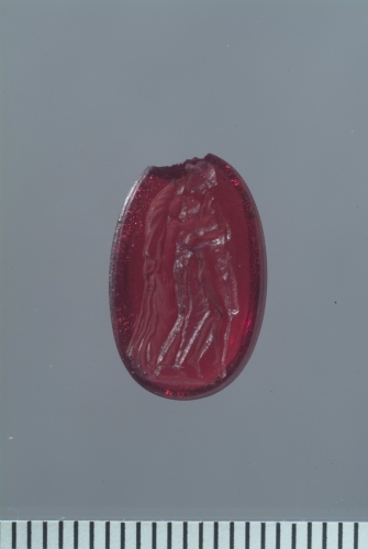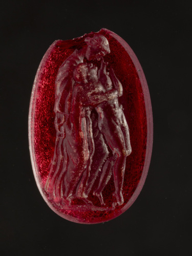 L'immagine glittica, replicata da una serie di intagli e soprattutto paste vitree, presuppone un preciso modello, conservato anche da un rilievo neo-attico dell'Ermitage di Pietroburgo (sulla questione Toso 2007, p. 144; cfr. anche Sena Chiesa 1997, p. 129).