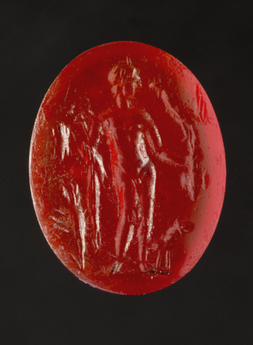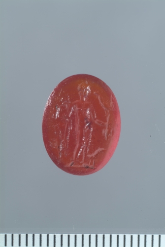 In una corniola è raffigurato Mercurio, nudo, stante di prospetto su breve linea del suolo, la gamba destra lievemente flessa, la testa di profilo verso destra. Il dio regge il caduceo col braccio destro, dal quale ricade il mantello; nella mano sinistra protesa tiene la borsa (marsupium). A destra, sopra il braccio, è raffigurato un gallo, in basso un capro; a sinistra si vedono invece una piccola tartaruga all'altezza del gomito e, al di sotto, uno scorpione: si tratta degli animali totemici di Mercurio.