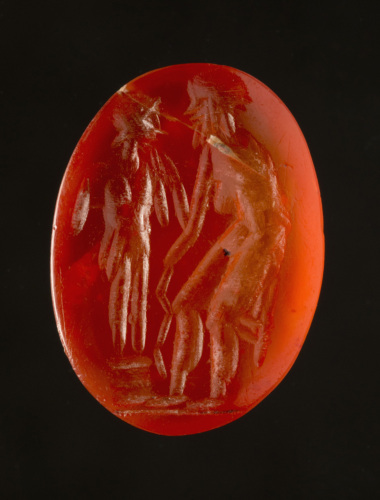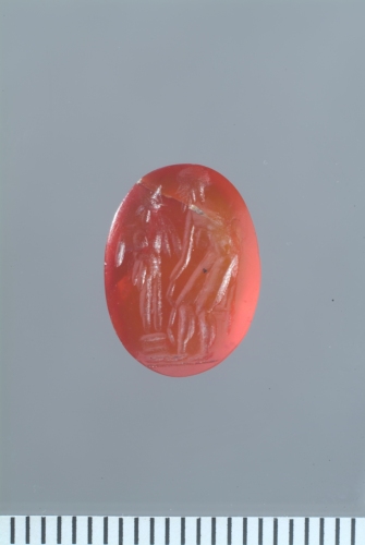 In una corniola è raffigurato a destra un uomo barbato, stante su breve linea del suolo, leggermente chino in avanti, nudo con un mantello che scende dietro la schiena (?); si appoggia con la mano destra a un bastone con andamento a zigzag. Davanti a lui, nella parte sinistra della pietra, una statua su bassa base circolare, forse elmata. Intaglio corsivo.