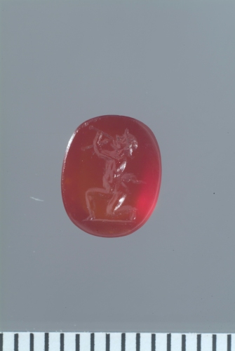 Su una corniola è raffigurato un satiro barbato di profilo verso sinistra, inginocchiato al suolo, con il ginocchio sinistro, in primo piano, appoggiato a terra, sulla linea del suolo. Sta suonando il doppio flauto, che sostiene con entrambe le braccia sollevate; la testa è leggermente piegata all'indietro. Da notare la coda, che richiama la natura ferina del personaggio mitologico.