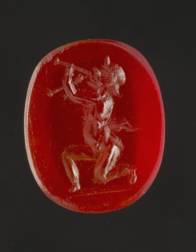 Il doppio flauto, così come tutti gli strumenti a fiato, sono tipici dei personaggi del corteo dionisiaco (basti pensare a Marsia). Più difficile, invece, trovare precisi confronti per la posizione assunta dal satiro in questa corniola.