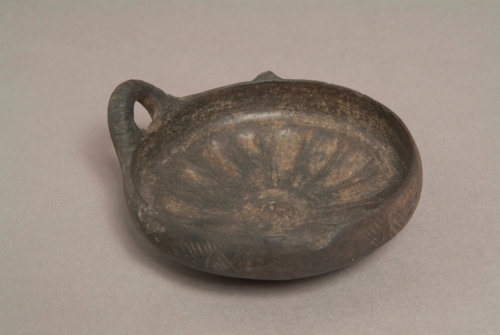 Bacino costolato a profilo troncoconico, spalla arrotondata, orlo assottigliato, fondo umbilicato, ansa a bastoncello cilindrico decorata a tacche verticali impresse, impostata verticalmente sull'orlo. L'orlo ai lati della ansa presenta due costolature verticali, di cui una mancante, cui segue, ripetuto per tre volte, un motivo a pseudo-cordicella impressa, costituito da un fascio di sette linee oblique incrociato da una sola linea obliqua.