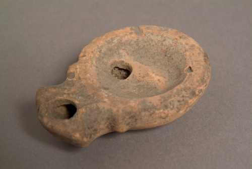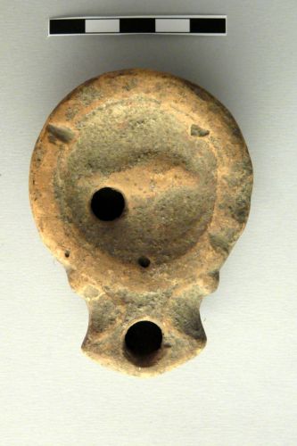 serbatoio troncoconico, spalla lievemente pendente all' interno, becco angolare, disco concavo delimitato da una solcatura circolare; al centro un pesce che la consunzione della matrice non permette di identificare con esattezza, anche se il motivo rientra genericamente nel motivo Balestrazzi III.e / Larese-Sgreva 153