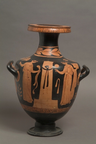 Si tratta di una probabile scena di omaggio alla stele del defunto, secondo un uso frequente su hydrie apule dal III° venticinquennio del IV sec.a.C., caratterizzate da una notevole affinità stilistica nella raffigurazione delle figure femminili.