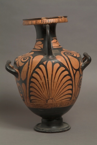Corpo ovale allungato, spalla leggermente obliqua, alto collo, bocca a disco con risega, orlo ribattuto, piede modanato con risega, anse a bastoncello, le laterali ricurve verso l'alto. Decorazione accessroia, trattini di vernice nera su fondo risparmiato sull'orlo e intorno all'attacco delle anse orizzontali; sul retro, sotto l'ansa verticale, grande palmetta a ventaglio tra girali che giungono fino alle anse orizzontali; sul collo corona di foglie di alloro; sotto la scena figurata, meandro a chiave interrotto da motivi cruciformi. Decorazione figurata: due donne con peplo e sphendone presso una stele funeraria; la donna di sinistra regge un ventaglio ed una tenia, l'altra uno specchio ed una cista; nel campo un ramoscello, una tenia ed un disco.