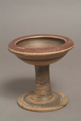 Bacino a calotta, orlo obliquo a mandorla, alto piede tromba con base appiattita ed espansa. La parte esterna dello stelo e la superficie interna del bacino sono interamente verniciati; l'orlo verniciato presenta due sottili linee risparmiate, una fascia orizzontale a vernice bruna decora la superficie risparmiata del bacino.