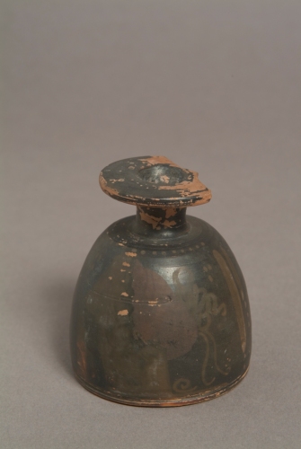 Aryballos campaniforme, con imboccatura a disco, fondo distinto da una solcatura. Interamente verniciato, fondo esterno risparmiato. In fase di revisione della scheda è emerso che il reperto presentava originariamente una decorazione dipinta in rosso, racchiusa entro una cornice di cui si distinguono due file perpendicolari di puntini. Entro lo spazio così delimitato, appare appena intuibile la presenza di una probabile testa volta a sinistra, forse una maschera teatrale.