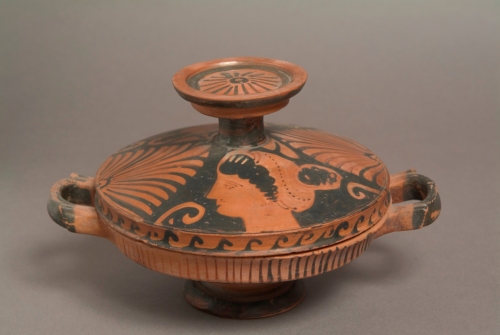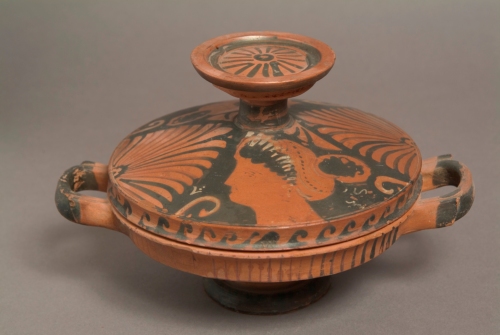 argilla colore camoscio chiaro,con ingubbiatura rosa;vernice bruno-nerastra,con chiazze rossastre per difetto di cottura,sovradipinture bianche