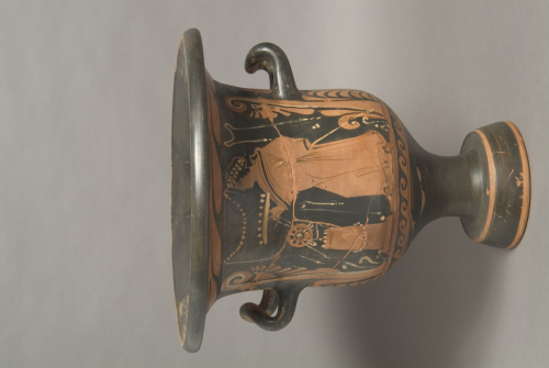 Labbro estroflesso, corpo allungato e fortemente rastremato sul fondo, alto piede modanato, anse a bastoncello orizzontali e ripiegate verso l' alto. Decorazione in A: Dioniso seduto sul manto posto su di un balzo roccioso. Reca in capo una corona di foglie e regge con la destra un piatto di offerte e con la sinistra un lembo del manto ed una corona. A destra è un'arula con offerte. In B: Giovane ammantato volto a sinistra con,sulla destra, un piatto di offerte. Davanti ad esso è un'arula con sopra una patera ornata di tenie. Le figure sono inquadrate da volute e palmette e pettine; nel campo vi sono tenie e corone. Decorazione accessoria: sotto l'orlo, corona di foglie di alloro; sotto le anse: palmette a ventaglio; sotto la zona figurata: meandro ad onda.