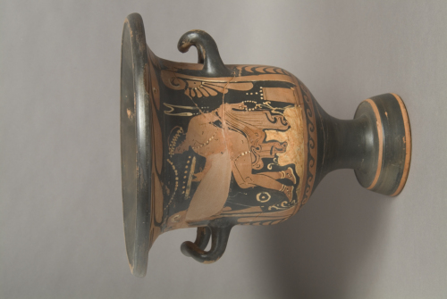 Attribuito al Pittore di Napoli 2585 per la presenza di alcuni motivi-firma: palmette triangolari ornate al centro da un punto e il bordo del mantello liscio e non dentato, secondo la consuetudine della ceramica pestana.